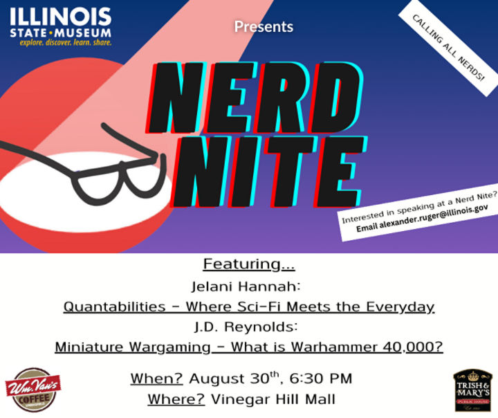 Join us at Vinegar Hill Mall for a back-to-back, one-two punch of nerd-dom. We’ll have Fermi Lab’s Jelani Hannah discussing Quantabilities: Where Sci-Fi Meets the Everyday, and J.D. Reynolds will bring us Miniature Wargaming: What is Warhammer 40,000? ",